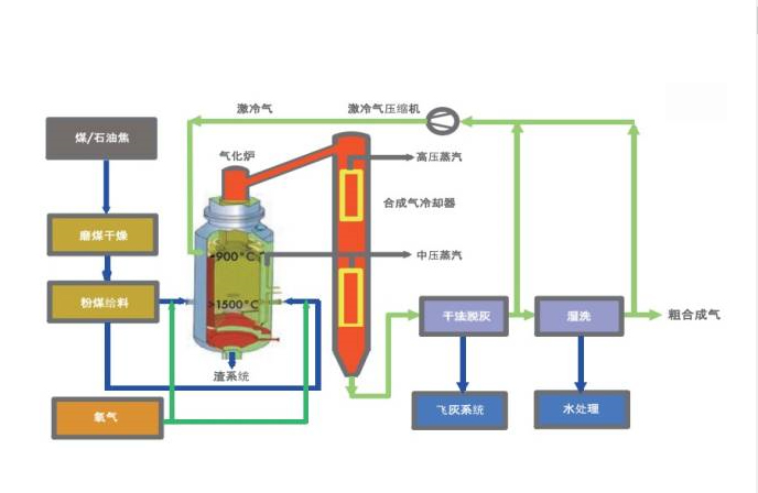 干粉氣化工藝的基本過程:原煤加助燃劑,破碎磨成煤粉,由高壓氮?dú)饬鬏斔瓦M(jìn)氣化爐,在壓力4.1 MPa、溫度1500—1600℃的條件下,與配加的氧氣和水蒸汽瞬時(shí)完成揮發(fā)分脫除、裂解、燃燒及轉(zhuǎn)化的一系列物理化學(xué)過程,氣化產(chǎn)物為粗合成氣,煤灰熔化以液態(tài)流出。