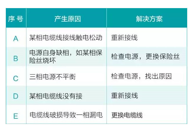 三相電機在運轉時必須由三根電纜線提供驅動電源,才能達到三相平衡運轉;如果由兩根電源線提供電源也能夠運轉,但運轉時間加長會導致電機因缺相燒毀電機。判別電機缺相方法: