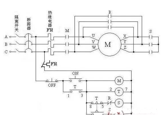 R接觸器,為啟動之后,把電機繞組首尾連接起來。即U-Z,Y-W,X-V三個繞組的三角形接法。 T時間繼電器,起動時,比如要讓電機在5秒內(nèi)完成起動進入正常運轉(zhuǎn)狀態(tài),就可把時間繼電器設定到5秒