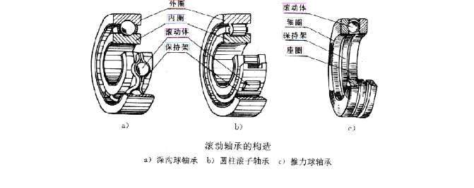 滾動軸承一般由外圈、 內(nèi)圈、 滾動體 和 保持架 四部分組成,嚴格的說是由外圈、內(nèi)圈、滾動體、保持架、密封、潤滑油 六大件組成。簡單來說,只要具備外圈、內(nèi)圈、滾動體就可定義為為滾動軸承。按滾動體的形狀,滾動軸承分為 球軸承 和 滾子軸承 兩大類。