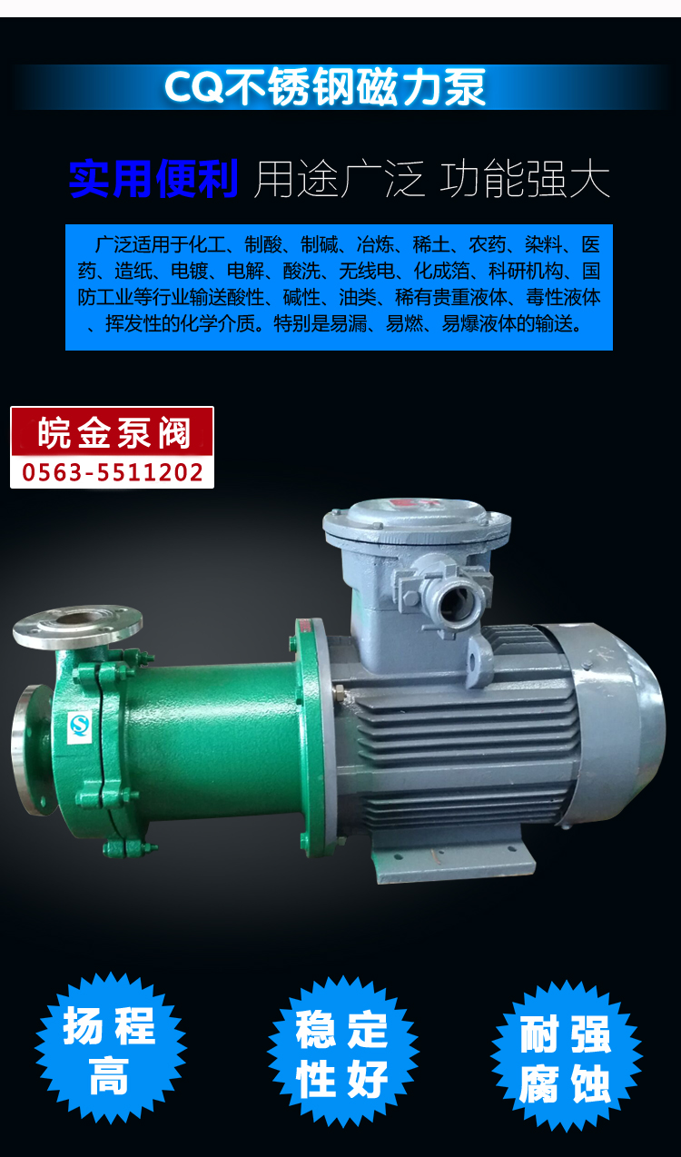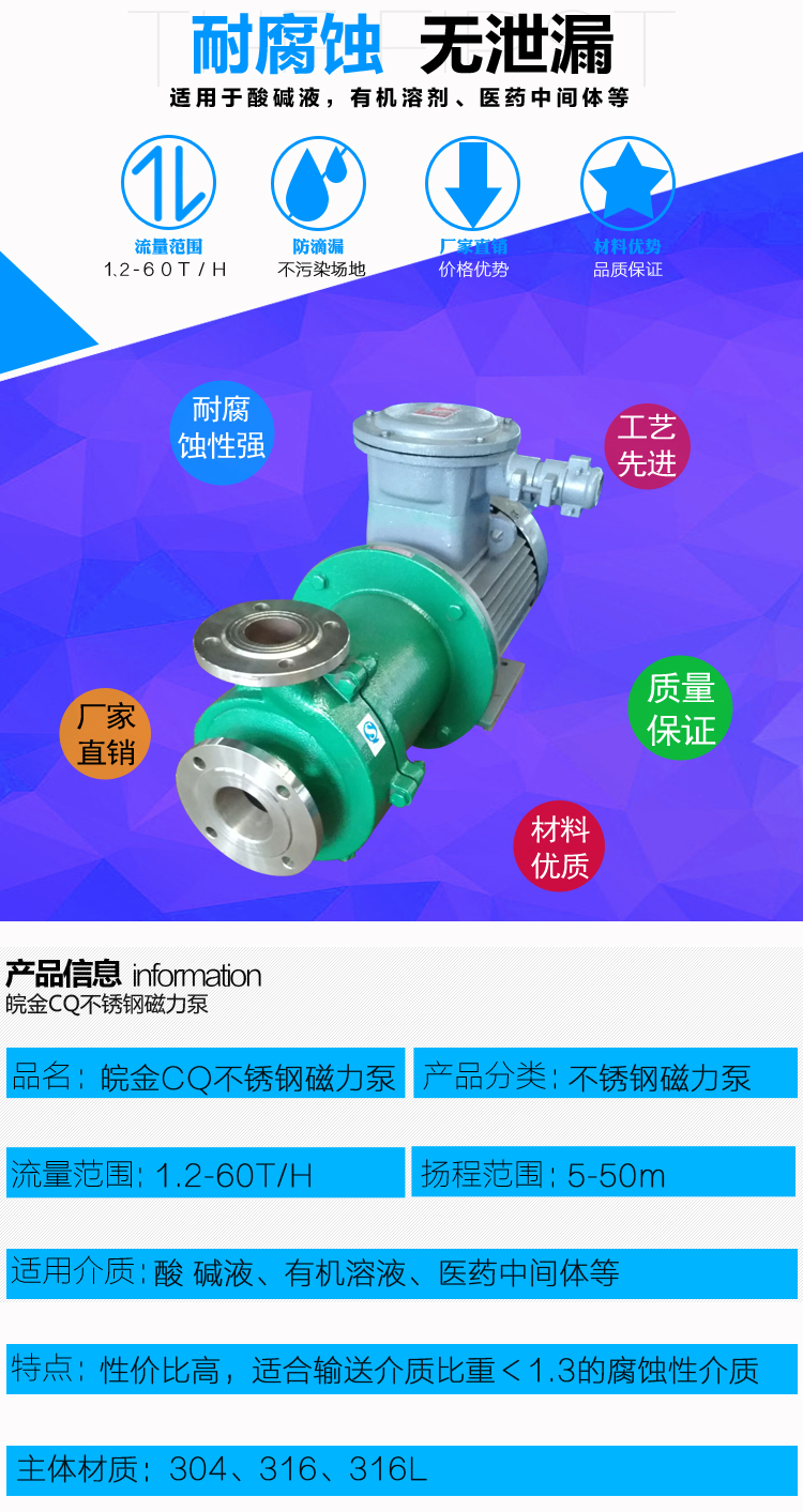 JCQ不銹鋼磁力泵是很早應(yīng)用的無泄漏不銹鋼泵,過流部件采用不銹鋼制成,是公司原CQ型升級產(chǎn)品,應(yīng)用于石油、化工、制藥、電鍍、環(huán)保、污水處理、酸洗等行業(yè)在金屬泵市場上該產(chǎn)品具有價格優(yōu)勢。產(chǎn)品結(jié)構(gòu)簡單,體積小,噪音低。