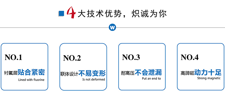 ZMD襯氟自吸磁力泵是我公司新一代耐腐蝕自吸磁力泵,它不但集氟塑料磁力泵的優點,而且具有自吸功能、無泄漏,這是以往的所有氟塑料磁力泵不能達到的,因此,該系列泵一推出就受到了廣大用戶的歡迎。該系列泵可廣泛適用于化工、有色金屬冶煉、農藥、制酸制堿、造紙、酸洗工藝、稀土分離、電鍍、電子、化成箔、卸酸堿等行業或工作流程,是目前磁力泵品種中結構新穎的產品之一,且高效節能、安全實用。