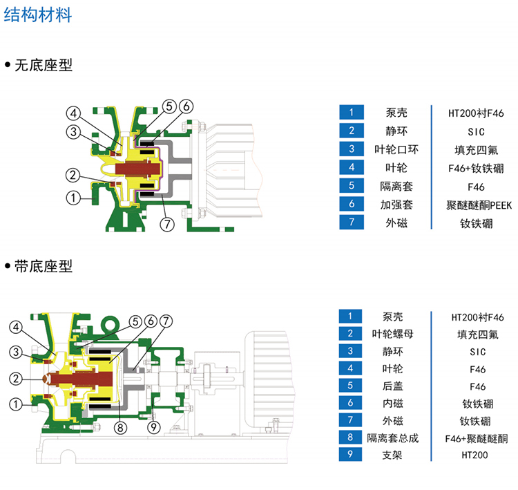 材料上:WJC-F耐腐蝕氟塑料磁力泵主軸、軸套采用間隙配合,且材質(zhì)均采用自潤滑抗干磨無壓燒結碳化硅制成。泵的加強套采用碳纖維增強PEEK,無磁渦流現(xiàn)象,磁鐵采用稀土外磁及內(nèi)磁,磁性超強且不退磁。