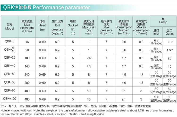 3、揚程、流量可通過氣閥開度實現無級調節(氣壓調節在1—7 bar之間):