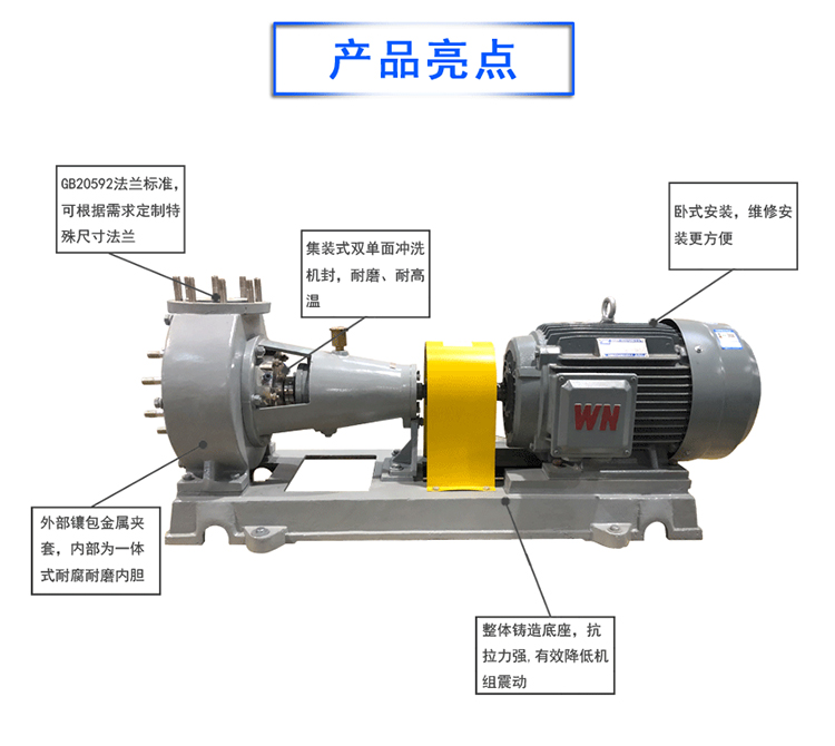 可根據客戶需要配置相應的沖洗方案,廣泛應用于酸洗,環保脫硫,脫硝,化工,造紙,染料污水處理等領域。改泵運行穩定,抗汽蝕性能強,特別合適含有顆粒雜質的酸堿性有腐蝕介質。具有高效節能,噪音振動低,可靠性高,壽命長,品質好、且價格公道合理等優點,是化工,酸洗,環保,脫硫,污水處理的理想輸出設備。